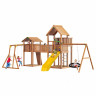 Игровая площадка изготовлена из клееного соснового бруса и массива сосны .Дерево обработано безопасной декоративно-защитной пропиткой. Технология значительно увеличивает срок службы конструкций, повышает прочность древесины, защищает её от гниения и грибков.