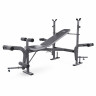 Скамья для жима силовая со стойками под штангу DFC D707 — идеальный выбор для домашних тренировок! Благодаря максимальной нагрузке до 180 кг и возможности регулировки парты для бицепса на 3 уровня в диапазоне от 60 до 76 см, этот тренажёр подойдёт для спортсменов разного роста и уровня подготовки. В комплект также входят съёмные валики, ручка для тяги на цепи и эспандеры на цепи, что позволяет разнообразить упражнения и повысить эффективность тренировок. Высота стоек под штангу варьируется от 84 до 115,5 см, а расстояние между стойками можно настроить под себя в диапазоне от 77,5 до 105,5 см. Нагрузка на стойки достигает 150 кг, на рычаг для валиков — 80 кг, а на ручки для тяги — 40 кг. Скамья имеет 5 уровней наклона спинки, а размер спинки составляет  75 x 30 см. Размер сиденья равен 35 x 30 см, расстояние от сиденья до пола — 54 см. Размер тренажера в рабочем виде составляет 150 x 105,5 x 115,5 см.